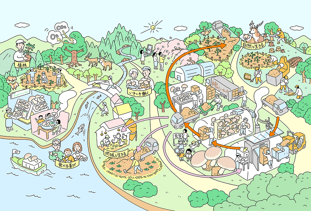 WEBサイトのメインビジュアルをデザインしました。お客様の要望を踏まえ、テーマである「自然と人の循環型社会」を手描きタッチで表現しました。